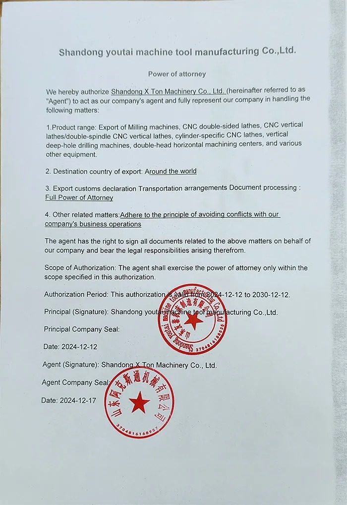 Vekalet Yetkisi: Yetki kapsamında, Shandong X Ton Machinery Co., Ltd., ihracat işiyle ilgili tüm işlemleri Shandong Youtai Machine Tool Manufacturing Co., Ltd. adına yürütme hakkına sahip olacaktır. Bu, gümrükler, lojistik şirketleri, bankalar ve diğer kurumlarla iletişim ve koordinasyonun yanı sıra gerekli ihracat belgelerinin ve malzemelerinin hazırlanması ve sunulmasını da içerir.